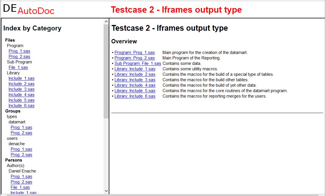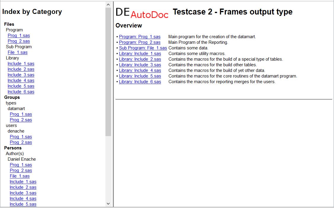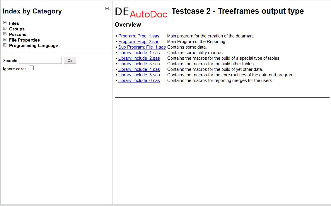 This output type creates a framed output with two frames. The left frame contains an index of the contents in a tree list. The tree nodes of the list can be expanded and folded dynamically. For this functionality, JavaScript has to be enabled in the users browser. It has two main sections.