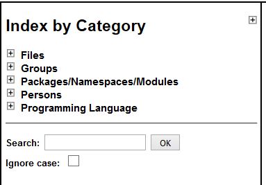 As in the framed output, the output is first grouped by the file type (program, library, etc.). Then the index is grouped by special groups defined in the markup. The output looks like in the following screenshot.